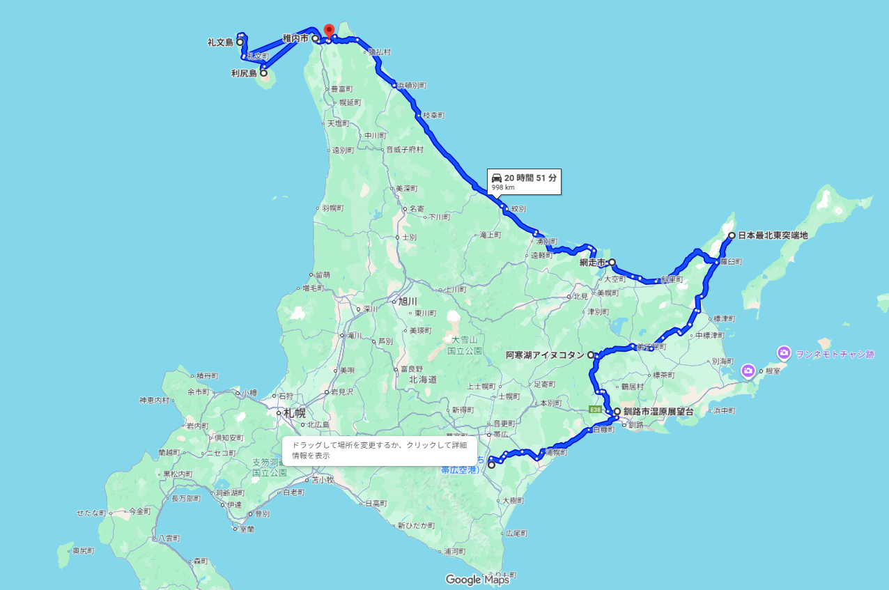 ルートは 帯広 → 知床 → 稚内。