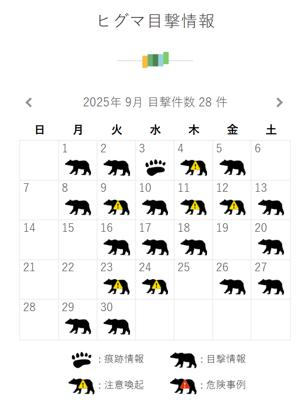 遊覧船が欠航となったため、代わりに知床五胡へ向かいました。入口は「知床五胡フィールズハウス」という施設で、ここから散策路が始まります。コースは、高架木道と地上遊歩道の二種類がありますが、この日はクマの目撃情報があったため、地上遊歩道は閉鎖されていました。本来は五つの湖をめぐる大ループコースを歩く予定でしたが、入れるのは高架木道のみで、「一湖」だけの見学となりました。とはいえ、往復で約1.6kmあり、景色を眺めながら歩くにはちょうどよい距離でした。高架木道の先からは知床連山や湿原が一望でき、整備も行き届いています。クマの出没情報は公式サイトのカレンダーで公開されており、見ると目撃件数はかなり多く、閉鎖は日常的のようでした。